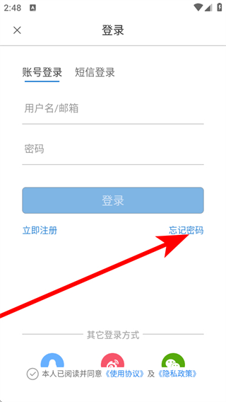2、在登录选择页面,点击忘记密码选项,进入找回密码页面。