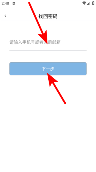 3、在找回密码页面,输入手机号或注册邮箱后点击下一步按钮,进入验证码验证页面。