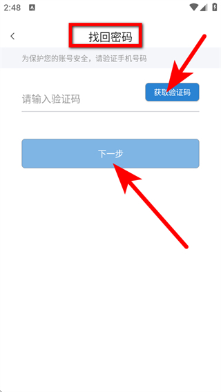 4、在验证码验证页面,点击获取验证码按钮,输入验证码后点击下一步按钮,即可进行密码找回操作。