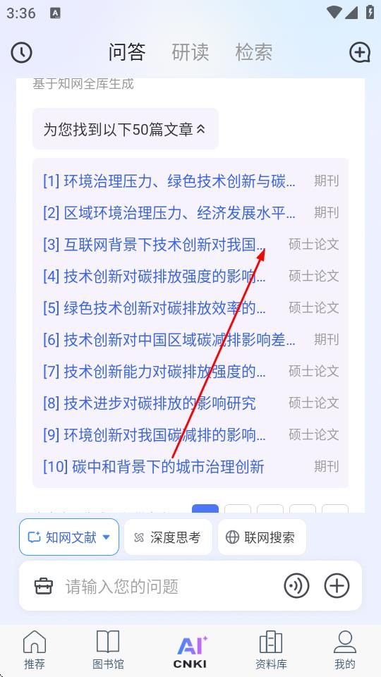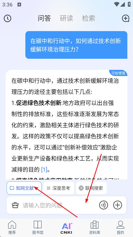 1、打开全球学术快报App,进入AI问答界面,输入问题获取答案后,点击知网文献。
