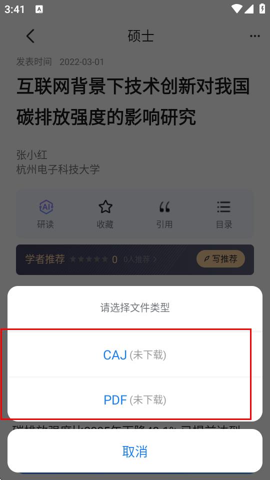 4、弹出请选择文件类型的窗口后,选择想要下载的文件格式,比如CAJ或PDF,完成论文下载。