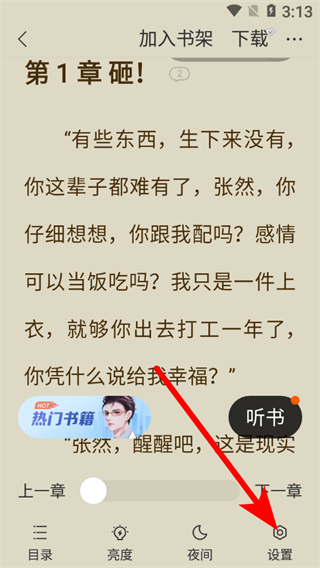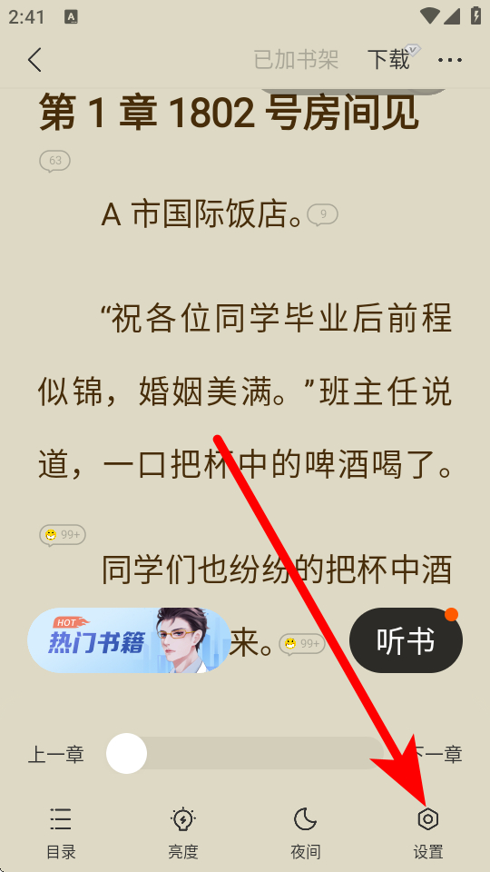 2、在阅读界面中,点击屏幕调出底部菜单,然后点击右下角设置选项。