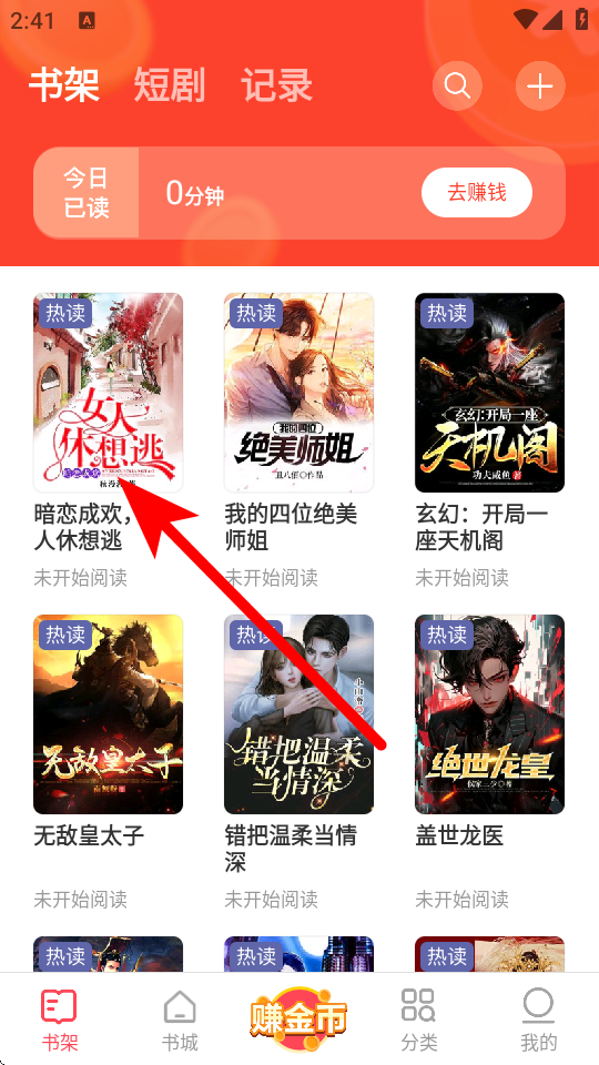 1、在速读免费阅读小说书架页面,点击要阅读的书籍封面,进入阅读界面。