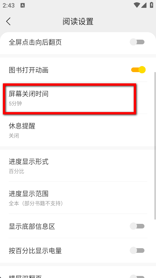 4、在阅读设置页面,找到屏幕关闭时间选项,可设置屏幕关闭的时长。