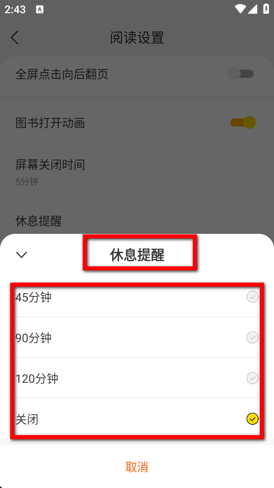 5、若需设置休息提醒,点击休息提醒选项,自己选择或关闭等提醒时间。