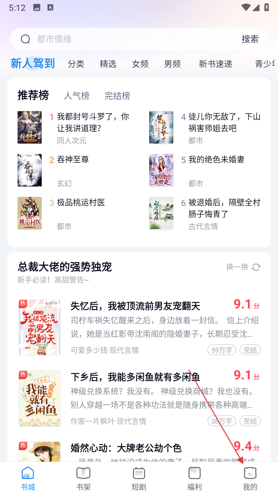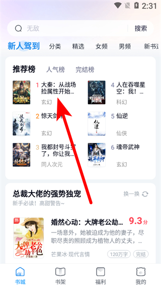 1、在飞读小说app书城页面,选择目标小说,进入小说阅读页面。