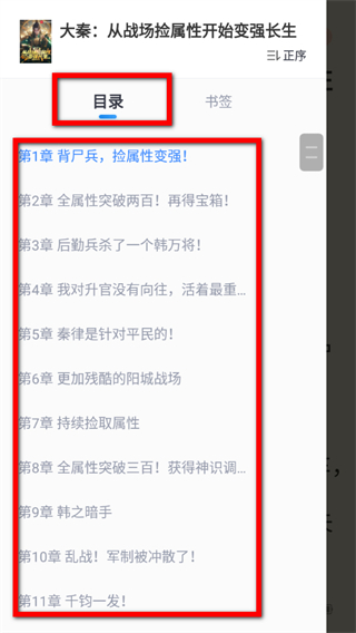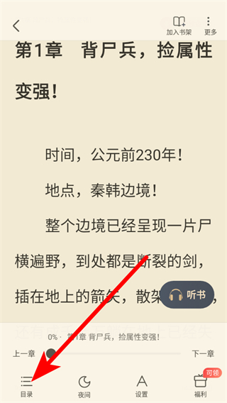 2、在小说阅读页面,点击左下角目录选项,弹出目录列表。
