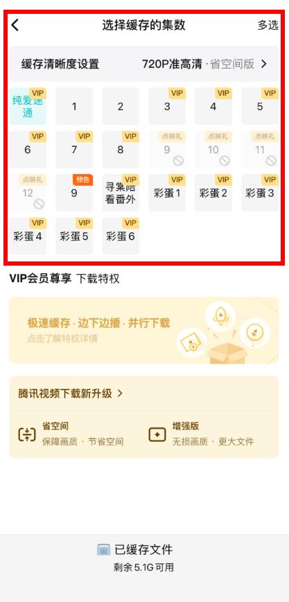3、进入选择缓存集数页面,选择想要缓存的集数以及设置缓存清晰度,即可将视频缓存到本地。