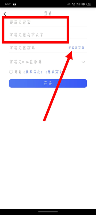 3、输入姓名、手机号码,点击获取验证码。