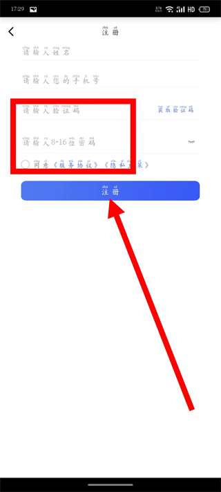 4、输入收到的短信验证码,设置8-16位密码,勾选后,点击注册按钮。