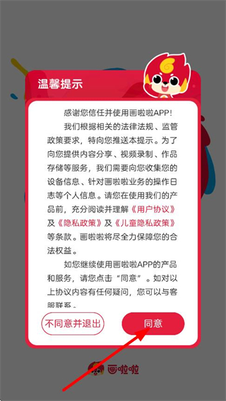1、在温馨提示弹窗中,点击同意,进入画啦啦美术课堂页面。