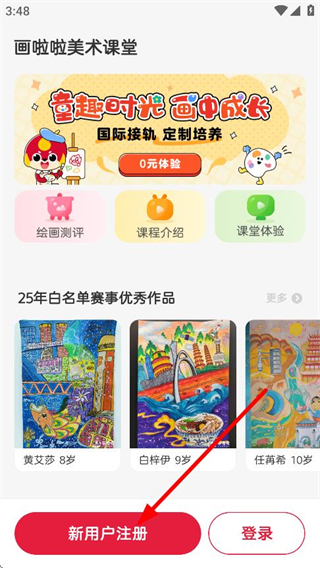 2、在画啦啦美术课堂页面,点击新用户注册,进入登录页面。