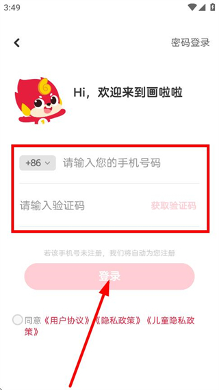 3、输入手机号码,点击获取验证码并输入,点击登录,完成账号注册登录操作。