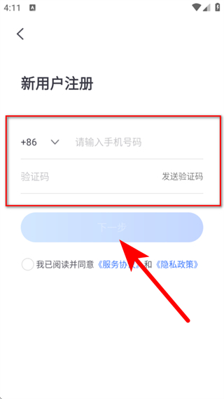 2、进入新用户注册页面,输入手机号码和验证码后,点击下一步。