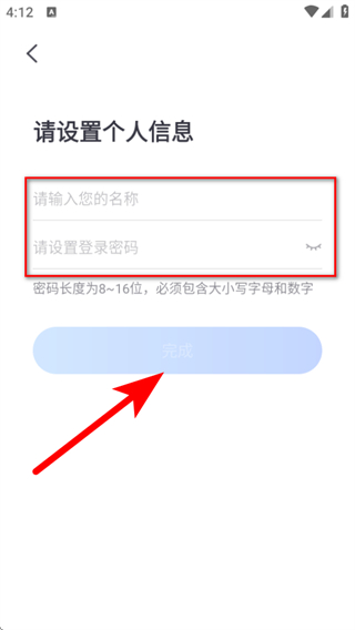 3、进入请设置个人信息页面,输入名称等信息,点击完成,即可完成账号注册。