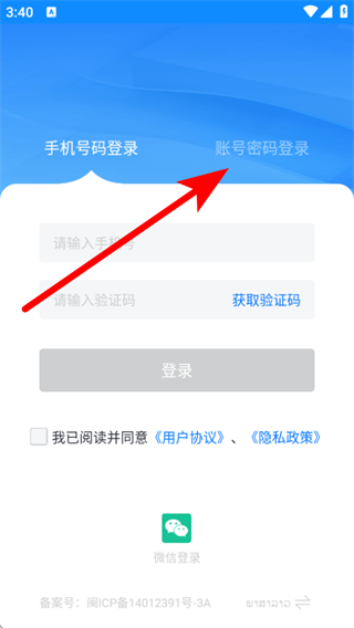 1、打开汽配云助手APP,进入登录界面后,点击账号密码登录。