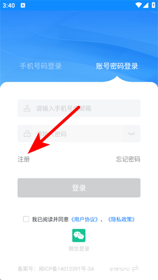 2、在账号密码登录界面,点击注册的按钮,进入注册的页面。