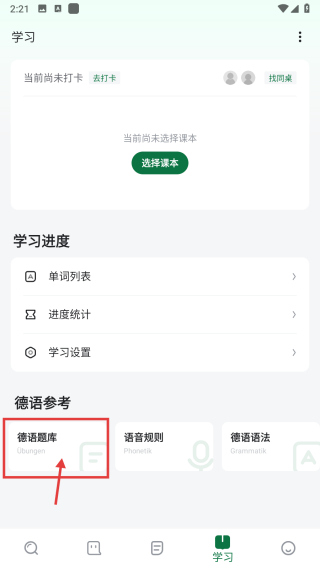 1、打开德语学习类APP,点击底部学习选项,进入学习板块页面。