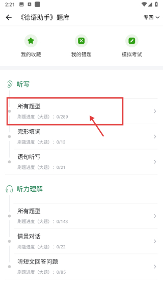 3、在题库页面,点击所有题型语句听写条目,进入语句听写练习页面。