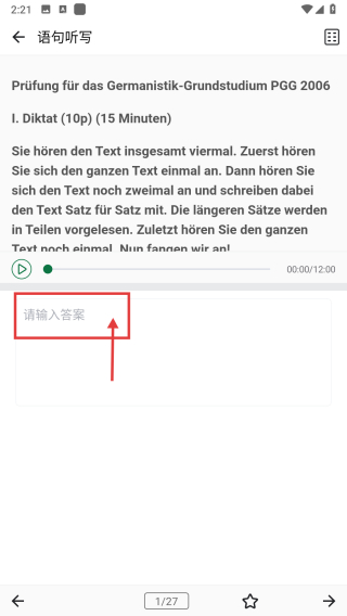 4、在语句听写练习页面,在请输入答案区域填写德语听写内容,完成练习操作。