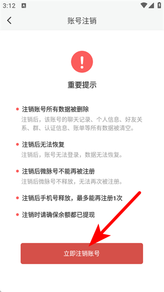 4、在账号注销提示页面,点击立即注销账号,完成微脉圈账号注销操作。