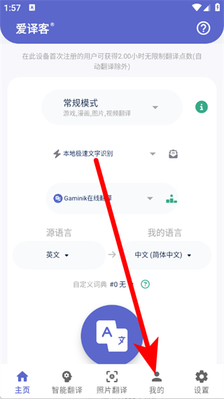 1、打开爱译客,点击底部导航栏的我的,进入个人页面。