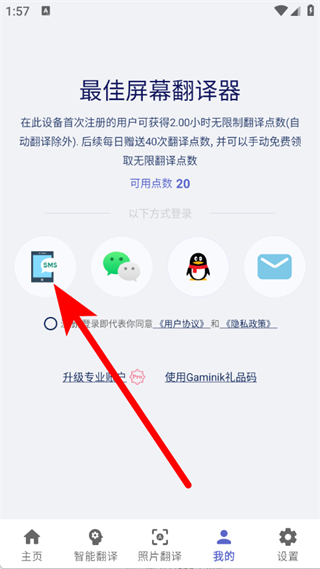 2、在个人页面,选择SMS登录方式,进入手机号登录注册页面。