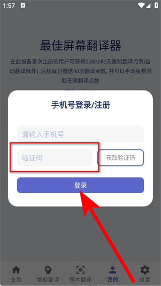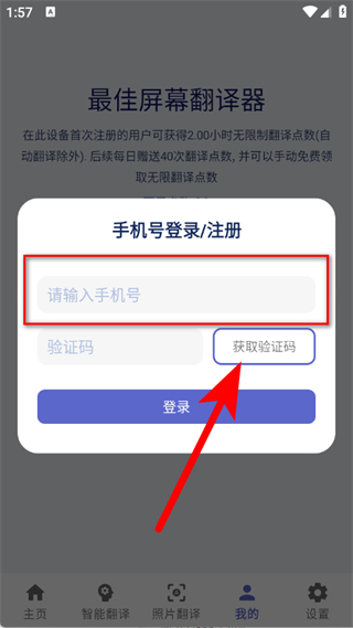 3、在登录注册页面,输入手机号码,点击获取验证码。