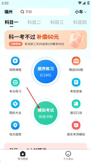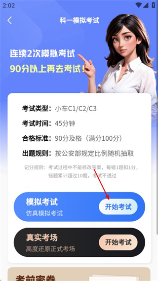 1、打开驾照考试速通,点击模拟考试,可进入科一模拟考试页面。