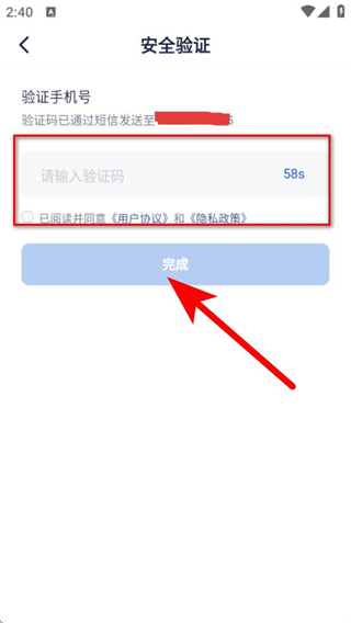 4、在安全验证页面,输入验证码后,点击完成随后设置新密码完成找回操作。
