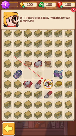 3、查看门卫大叔的装修工具箱,点击其中物品寻找可用工具。