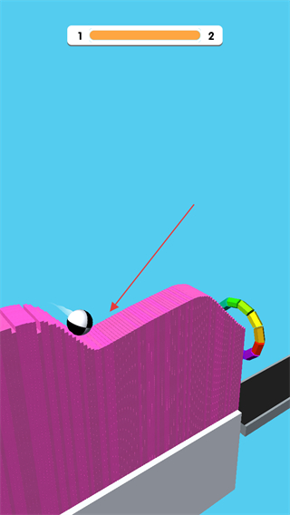 3、持续切割障碍物,到达彩色圆环区域后,黑白球会获得加速等效果,快速冲向终点轨道。