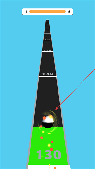 4、在终点轨道上,黑白球继续前进,到达绿色区域如显示130的区域,完成关卡,积累分数和进度,挑战更高关卡。