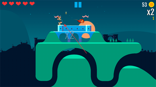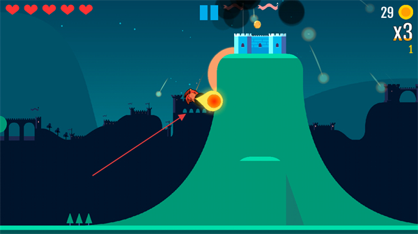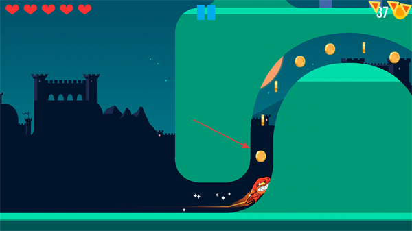 3、在蜿蜒地形中穿梭,收集沿途金币,保持血量左上角红心,避免碰撞障碍物。