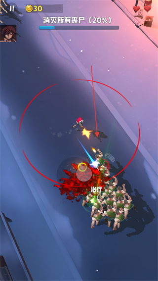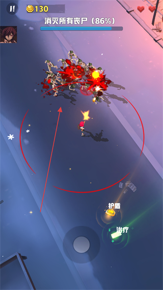 4、持续攻击丧尸,注意收集道具如护盾、治疗,直至消灭所有丧尸完成关卡。