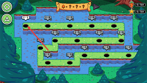 1、进入游戏后,在关卡选择界面点击【1-1】等关卡标识,可进入对应关卡,同时可查看【胡萝卜-0/50】【星星-0/50】的收集进度。