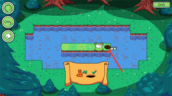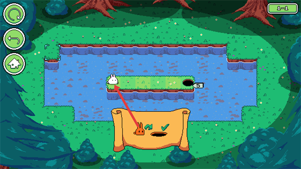 3、移动兔子时,触发路径上的互动元素(如圆环),会推进关卡进程,此时卷轴提示也会更新。