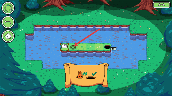 2、在关卡内,根据下方卷轴的提示,操控兔子在绿色路径上移动,左侧的重玩、返回、主页按钮可在需要时使用。