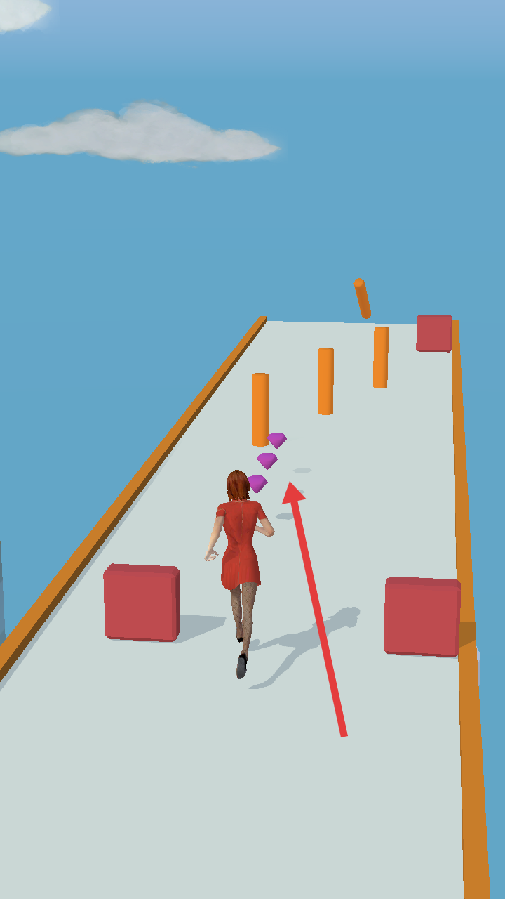 1、在赛道场景中,左右滑动操控穿红裙的角色,开始跑酷挑战,注意前方的橙色柱子和障碍物。