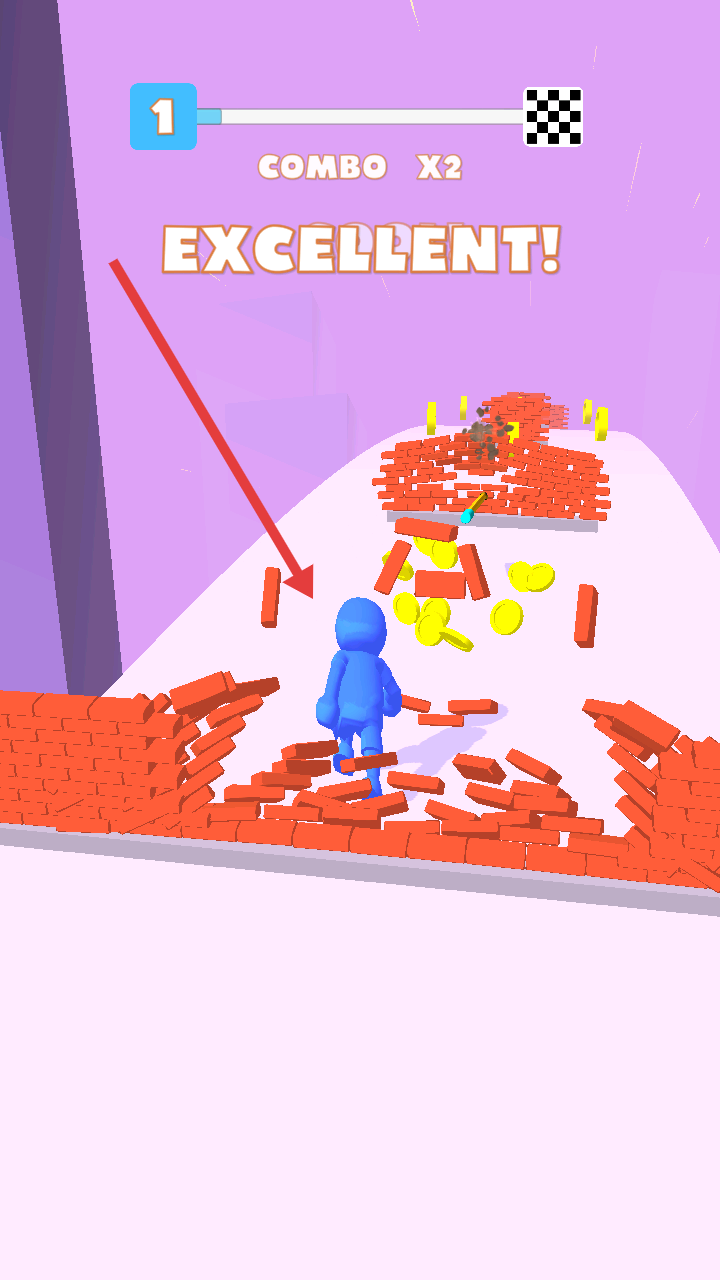 1、左右滑动操控蓝色角色,在紫色场景的赛道上开始破坏砖块的挑战。
