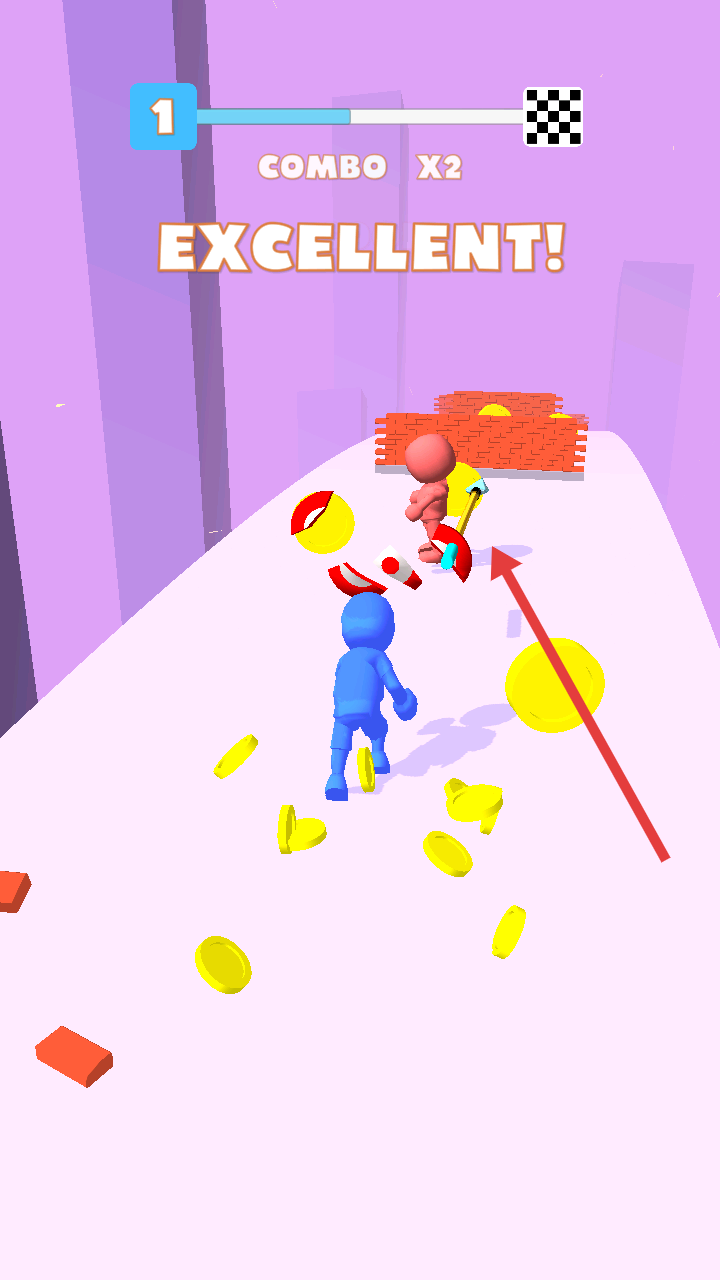 2、滑动角色,破坏红色砖块,收集金币,推进关卡进度。