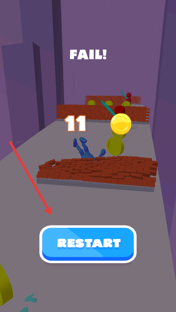 4、若挑战失败,点击RESTART按钮重新开始,提升滑动操控的精准度以顺利通关。