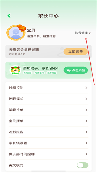 1、打开爱奇艺动画屋的应用,在家长中心的界面内点击账号管理。