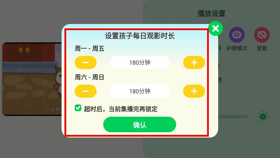 3、根据需求设置孩子每日观影时长,设置完成后点击确认,即可在设定时间到达时关闭播放声音。
