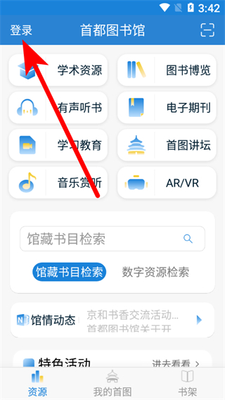 1、在首都图书馆app首页,点击左上角登录选项,进入登录页面。