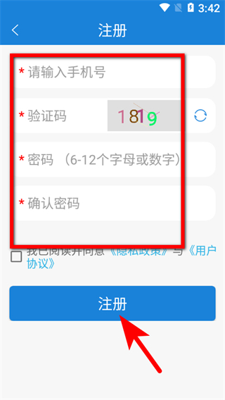 3、在注册页面,输入信息,勾选同意协议后点击注册按钮,即可完成注册操作。