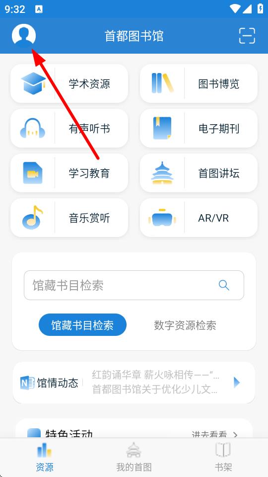 1、打开首都图书馆app,点击左上角的头像图标进入个人相关页面。