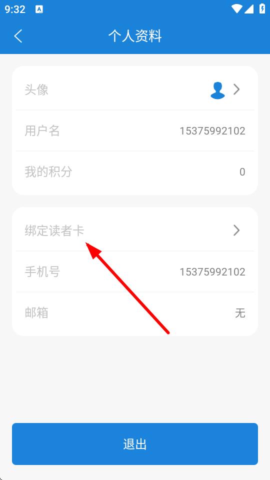3、在个人资料页面里,找到并点击绑定读者卡选项。