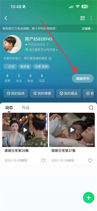 3、在个人主页点击编辑资料,进入编辑资料页面。