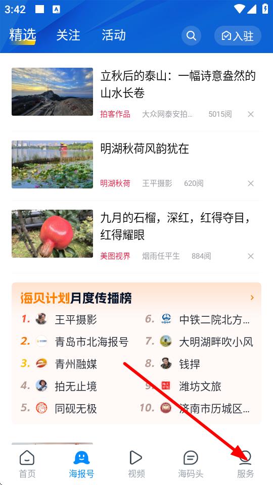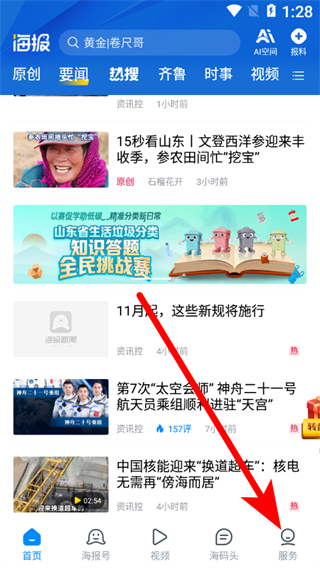 1、在海报新闻首页,点击右下角服务选项,进入服务页面。